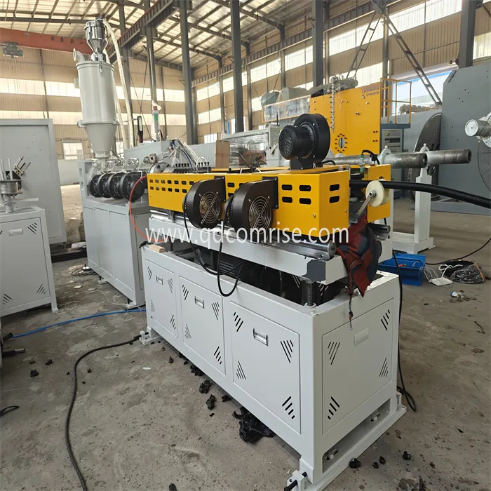 ທໍ່ໄດ້ເຂົ້າໄປໃນ corrugator, ບ່ອນທີ່ມັນມີຮູບຮ່າງເປັນຮູບທີ່ຕິດກັນໂດຍໃຊ້ທ່ອນໄມ້ mold ແລະຄວາມກົດດັນຂອງເຄື່ອງດູດ.